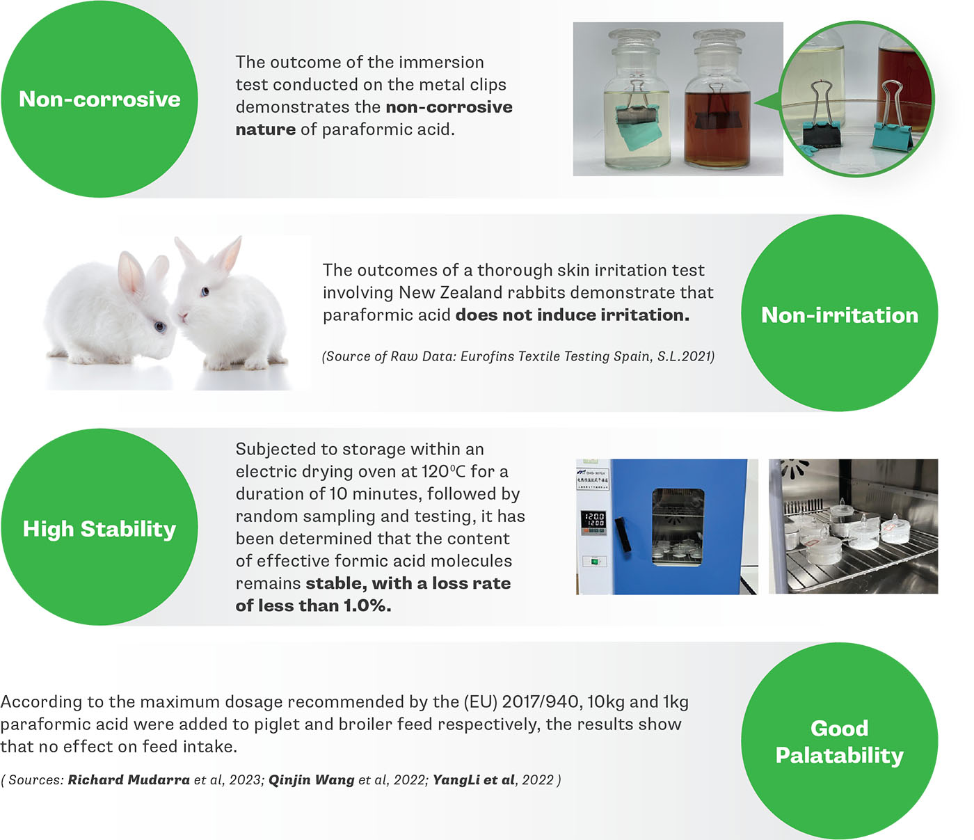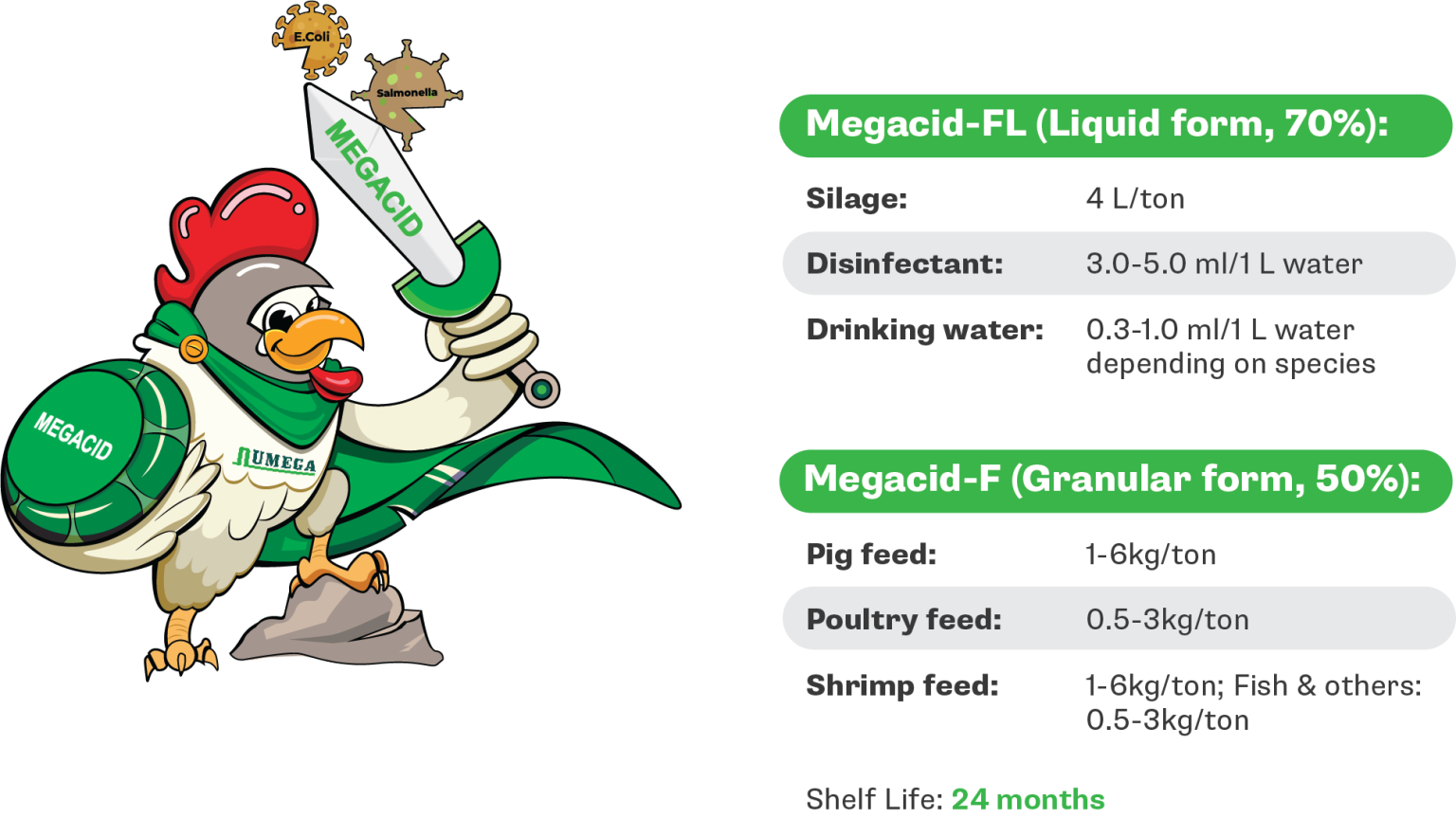 Megacid is a new formic acid derivative (Paraformic acid) invented and patented by UAB Chemical College in Spain. It possesses non-corrosive, non-irritating, and low pH physical and chemical characteristics. It can be widely used in livestock, aquaculture, rubber, and other chemical industries. Numega is the only company in the world that has the production and marketing rights for paraformic acid.